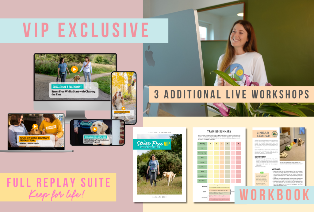 ⭐ Exclusive-to-VIP Stress Free Walks Companion Guide full of trackers and checklists and prompts and guides to the activities to streamline your training experience, ensuring that every step is well-documented, tracked, and celebrated. I've even thrown in some extra step-by-step dog training exercises that aren't included in the main syllabus.
